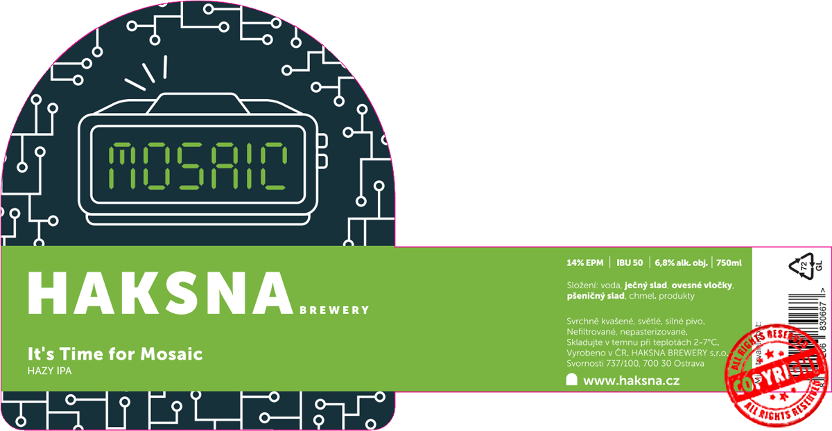 Hazy IPA náš oblíbený pivní styl. Zakalené, voňavé a stále hořké pivo. Toto je + začátek nové série piv s názvem "Its time for..". Tentokrát chmeleno odrůdou Mosaic jak v klasické tak Cryo variantě.
