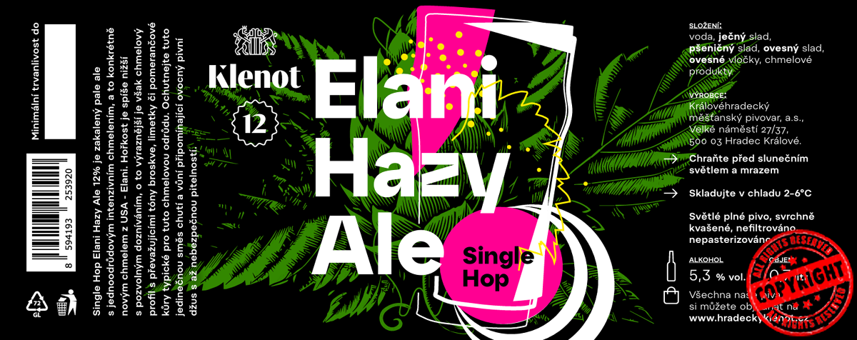 Složení:voda, slady (pale ale, plzeňský, pšeničné a ovesné vločky, pšeničný), chmely (Amarillo, Mosaic, El Dorado)