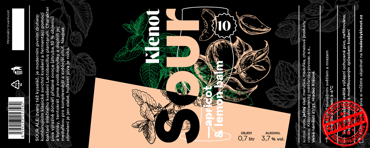 Sour ALE, zvaný též kyseláč, je moderním pivním druhem kombinujícím svrchní kvašení a fermentaci pomocí bakterií mléčného kvašení Lactobacillus plantarum. Významným doplňkem pak je přídavek ovoce (asi 10% celkového objemu), a bylinky, tentokrát jsme zvolili meruňky a doplniuli jej meduňkou pro komplexnější a svěžejší chuť. Naopak chmelení je jen slabé, hořkost piva je nízká.