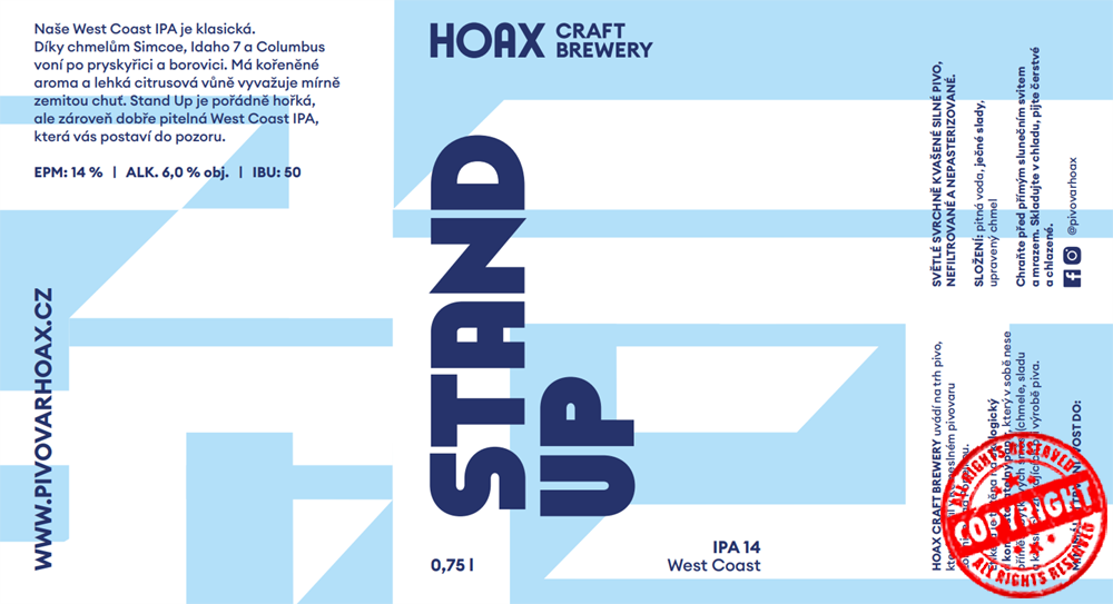 Naše West Coast IPA je klasická. Díky chmelů Simcoe, Idaho 7 a Columbus voní po pryskyřici a borovici. Má kořeněné aroma a lehká citrusová vůně vyvažuje mírně zemitou chuť. Stand Up je pořádně hořká, ale zároveň dobře pitelná IPA.