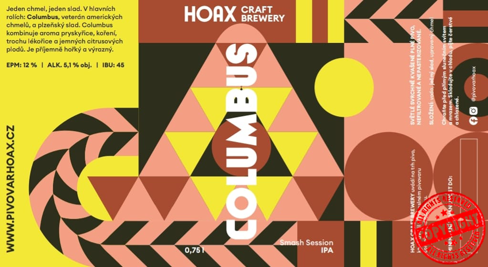 Smash Session IPA v barvách Hoaxu (jeden slad, jeden chmel) vychází z naší West Coast IPA Stand Up, a proto je v hlavní roli právě Columbus - ostřílený veterán amerických chmelů, který nabízí aroma pryskyřice, koření, trochu lékořice a citrusů. Je výrazný a příjemně hořký.