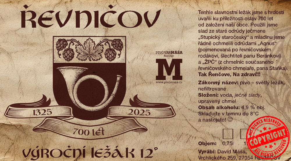 Tenhle slavnostní ležák jsme s hrdostí uvařili ku příležitosti oslav 700 od založení obce Řevničov. Použili jsme slad ze staré odrůdy ječmene "Stupický staročeský" a mladinu jsme řádně ochmelili odrůdami Agnus a ŽPČ.