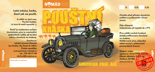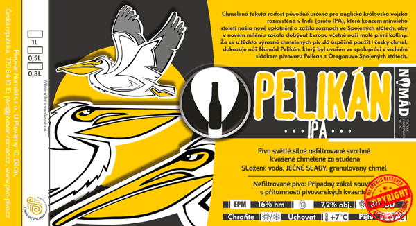 Chmelená tekutá radost původně určená pro anglická královská vojska rozmístěná v Indii (proto IPA), která koncem minulého století našla nové uplatnění a zažila rozmach ve Spojených státech, aby v novém miléniu začala dobývat Evropu včetně naší malé pivní kotliny. Že se u těchto výrazně chmelených piv dá úspěšně použít i český chmel, dokazuje náš Nomád Pelikán, který byl uvařen ve spolupráci s vrchním sládkem pivovaru Pelican z Oregonu ve Spojených Státech.