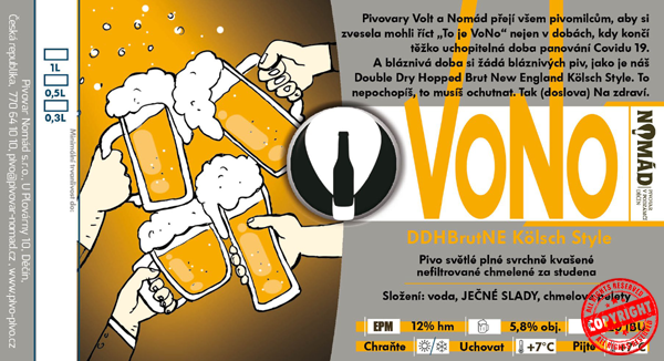 Výsledek spolupráce pivovarů Volt v Jablonci a Nomáda. Jak jména pivovarů napovídají, jde o pivo VoNo. Pivo je založeno na stylu Kölsch, který je sám o sobě hybridem, kdy kvasnice svrchního kvašení kvasí při vyšších, tedy ejlových teplotách a zrání piva se děje při teplotách používaných pro ležáky, spodně kvašených piv (rozuměj studené prostředí). VoNo je dvakrát chmeleno za studena, proto DDH, Double Dry Hopped. A že celá ta doba Covidu, která vlastně ještě teď doznívá, byla docela „mimózní“ , rozhodli jsme se pro chmel Mimosa. Ten dává pivu mandarinkový nádech. Brut v názvu stylu odkazuje na použití extra dávky enzymů, které zpracují všechny cukry uvolněné do sladiny z našrotovaných sladů. Tělo piva je pak velice lehké a u mnohých pivařů vyvolává dojem, že ani nepijí dvanáctku. Obsah alkoholu je pak samozřejmě vyšší, kolem 6% objemových. NE je pak zkratka odkazující na piva stylu New England, která jakožto odpověď na velmi hořká piva West Coast vařená craft pivovary na západním pobřeží USA, byla vařená na východním pobřeží spíš než hořká jako velmi voňavá, ale i zakalená.