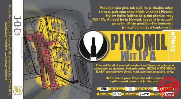 Pokud je vám pivo tak milé, že je chodíte mlsat i v noci, pak vám snad přijde vhod náš Pivomil. Stylem hořce laděná belgická pšenice, tedy Wit IPA. A nebyl by to Nomád, kdyby si to neuvařil po svém. Místo používaného koriandru jsme přidali anýz a kapku medu.