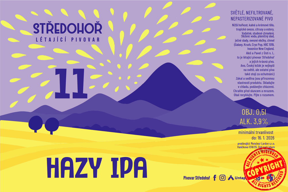 Složení:voda, pšeničný slad, ječné slady, ovesné vločky, chmel (Galaxy, Krush, Cryo Pop, HBC 1019), kvasnice (New England)