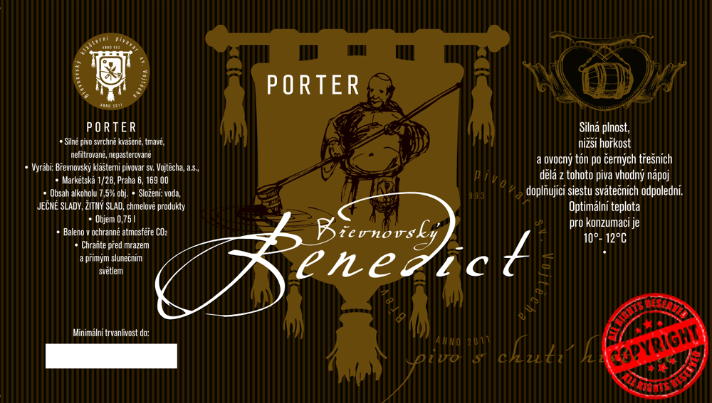 Břevnovský porter je uvařen infuzním rmutováním ze sedmi druhů sladu. Mezi nimi je například žitný slad či dva druhy karamelového sladu, ale také se k sypání přidává pražený nesladovaný ječmen. Pivo je chmeleno Žateckým poloraným červeňákem a britskou chmelovou odrůdou Northern brewer. Pivo má charakteristickou vyšší plnost, výrazné sladové tělo s vyváženou hořkostí a senzoricky výrazné ovocné tón po třešních, kandovaném ovoci a hořké čokoládě. Celkový senzorický dojem krásně dokresluje velmi krémovitá a hustá pěna.