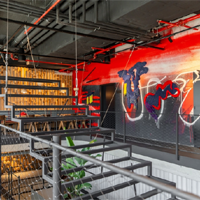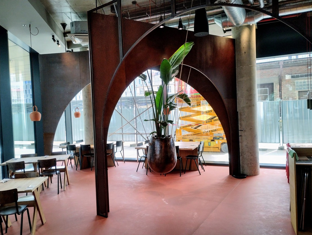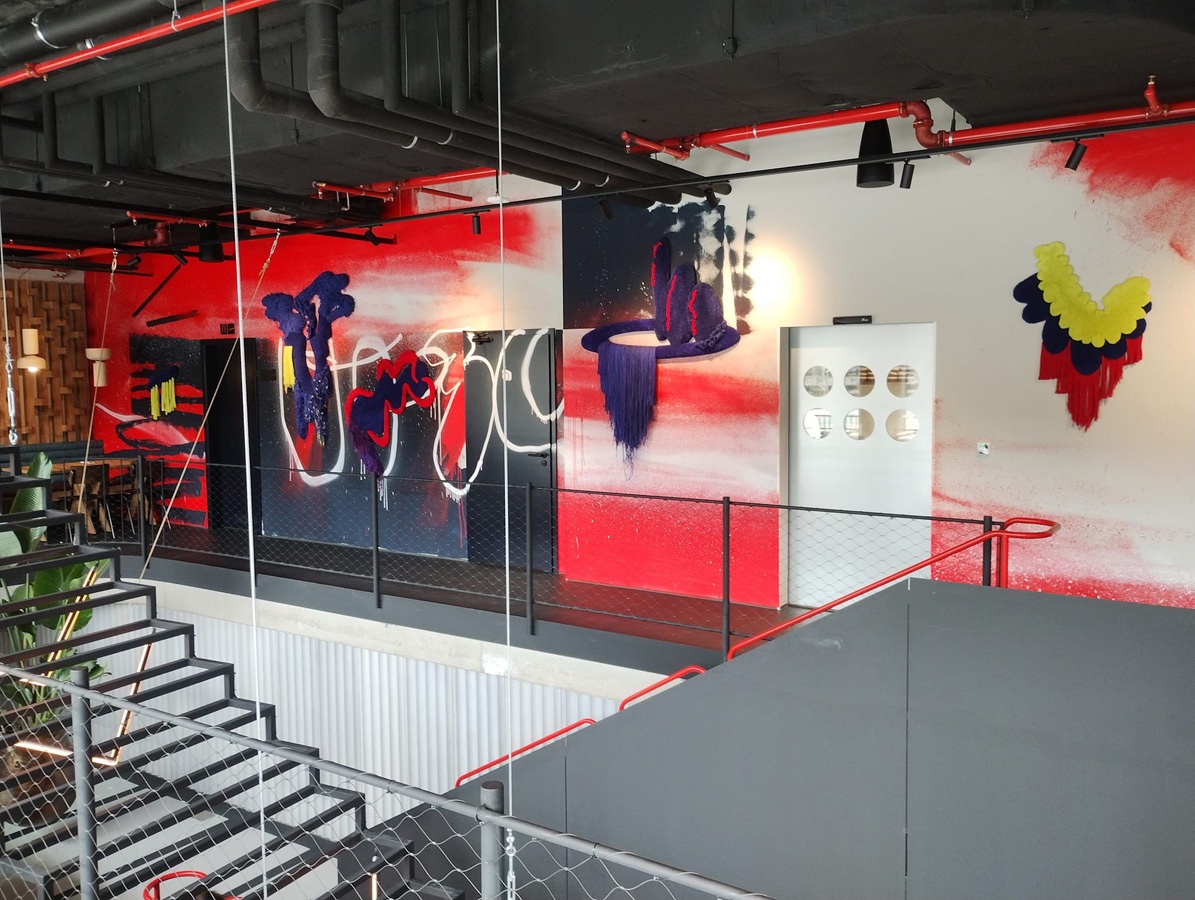 Prostor opticky předělují oblouky z rezavého kovu, výrazná svítidla, trubkové konstrukce nebo masivní závěsné květináče s rostlinami. Po stěnách se plazí barevné kobercové tapiserie od Masopustu, stoly i podlahu se zdáním ledabylosti zdobí ilustrace Tomáše Javůrka, zdi potom graffiti od Davida Strausse.