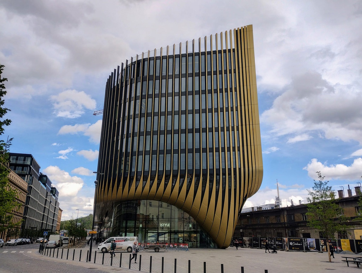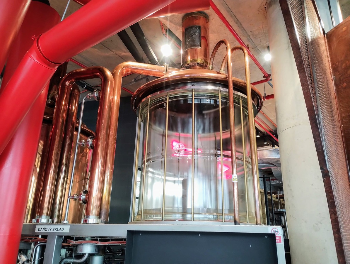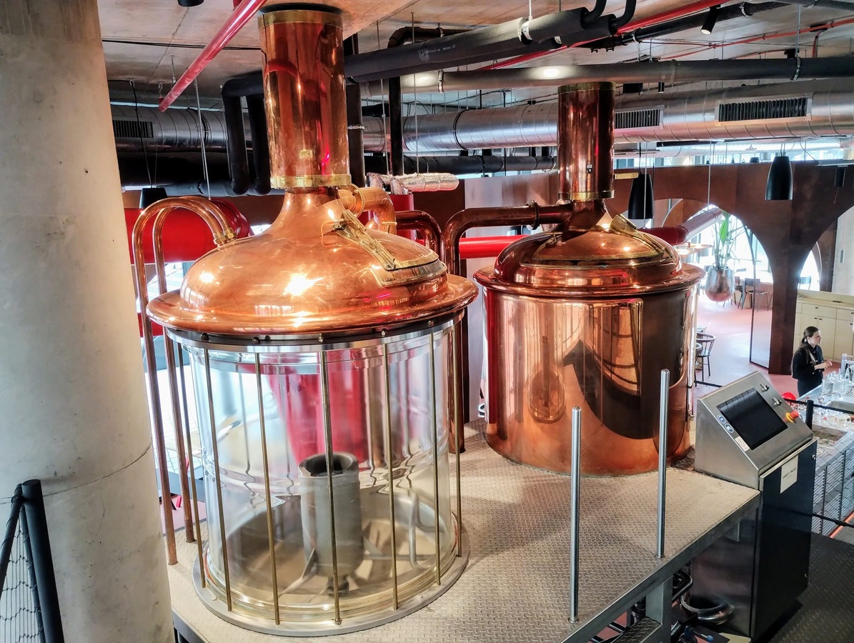 Nepřehlédnutelná stavba se zlatými vlnami je tak pravděpodobně jedinou kancelářskou budovou u nás, kde se zároveň vaří i pivo, které jde potrubím ze sklepních tanků rovnou do výčepu.