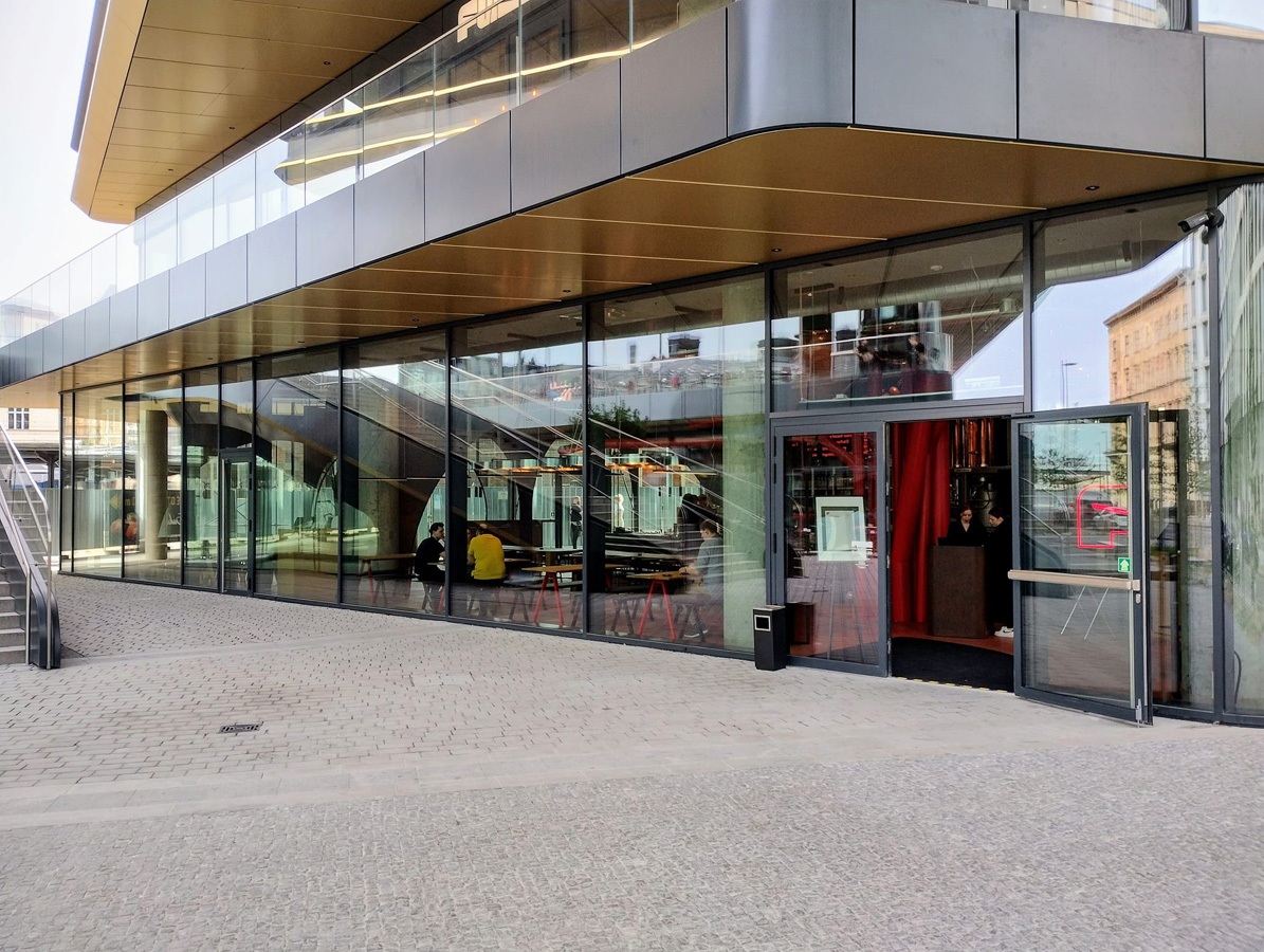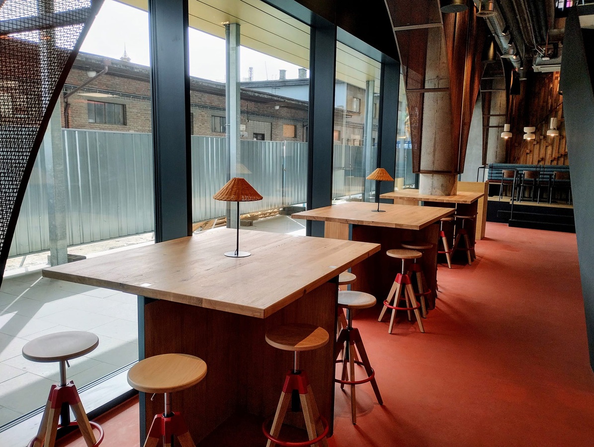 V prostoru schodiště mezi dvěma patry je prostor i pro živou hudební produkci v podobě DJ setů. Zatímco spodní slouží spíše jako jídelní zóna, vrchní patro propojené s terasou směrem k vlakovému nádraží je koncipováno i jako bar.