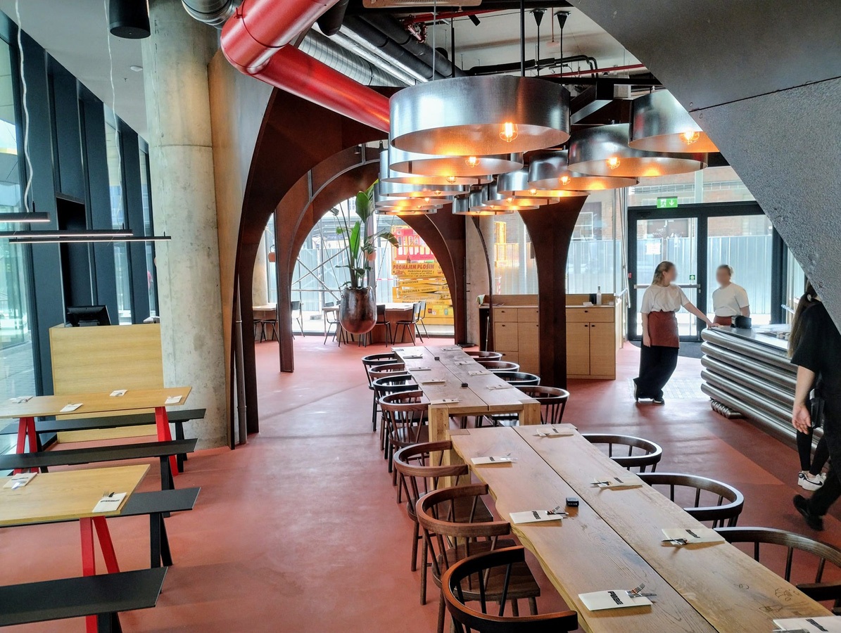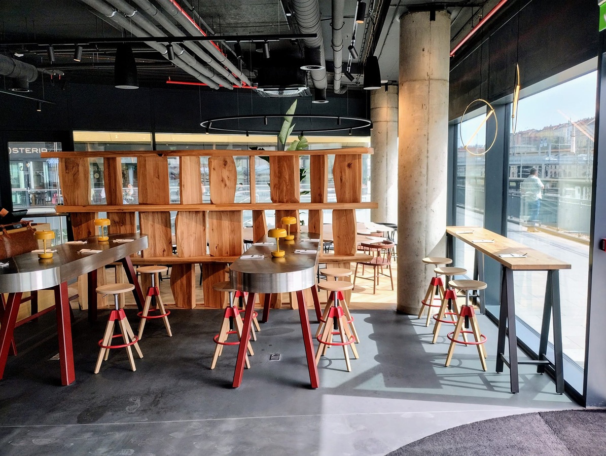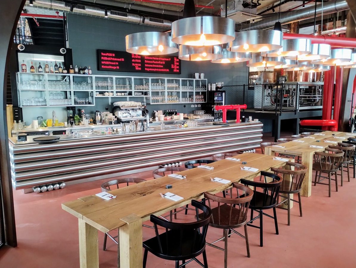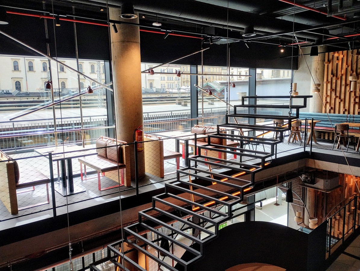 V obou patrech má zákazník možnost vidět kuchařům, výčepním i barmanům přímo pod ruce. Kuchyně jsou prosklené a otevřené do prostoru. Na terase po ochozech budovy, která by za dva roky měla být propojena s parkem na střeše nástupiště, přibude ještě dalších dvě stě míst.