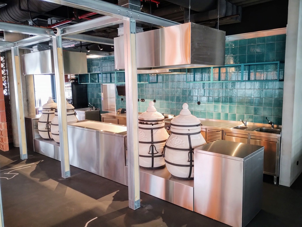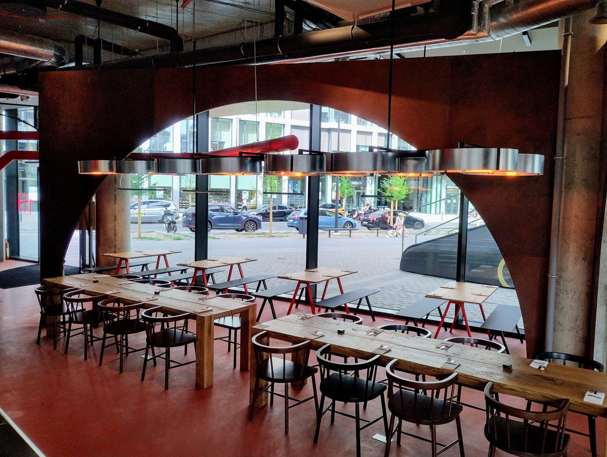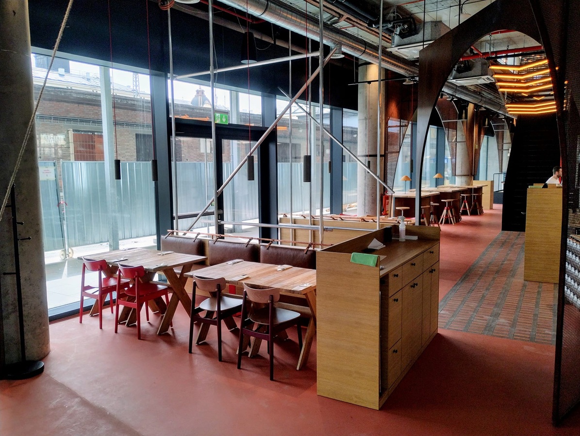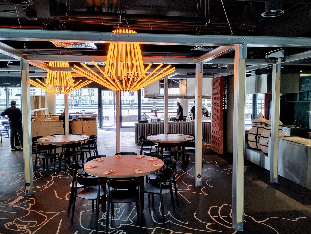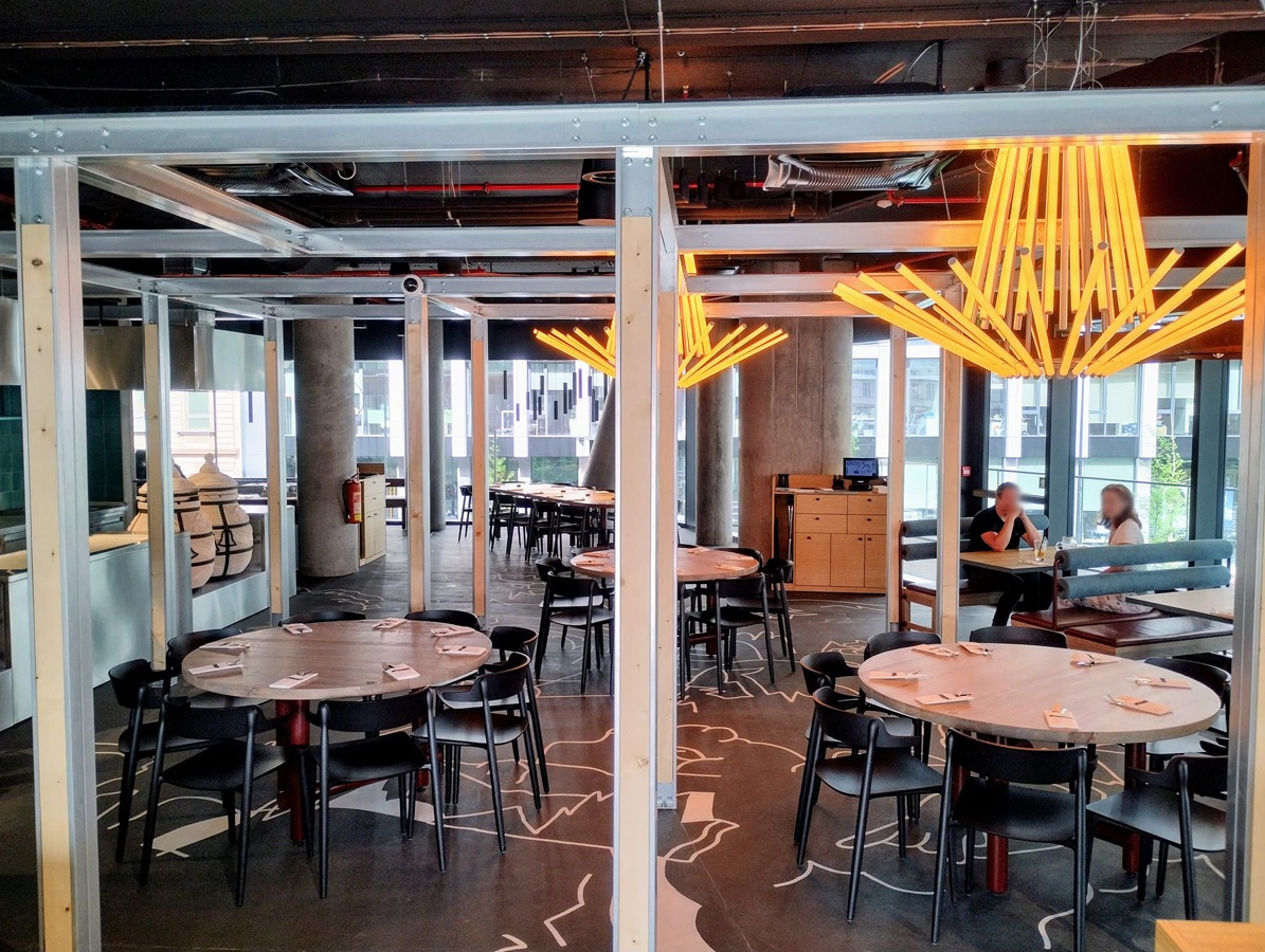 V obou patrech má zákazník možnost vidět kuchařům, výčepním i barmanům přímo pod ruce. Kuchyně jsou prosklené a otevřené do prostoru. Na terase po ochozech budovy, která by za dva roky měla být propojena s parkem na střeše nástupiště, přibude ještě dalších dvě stě míst.