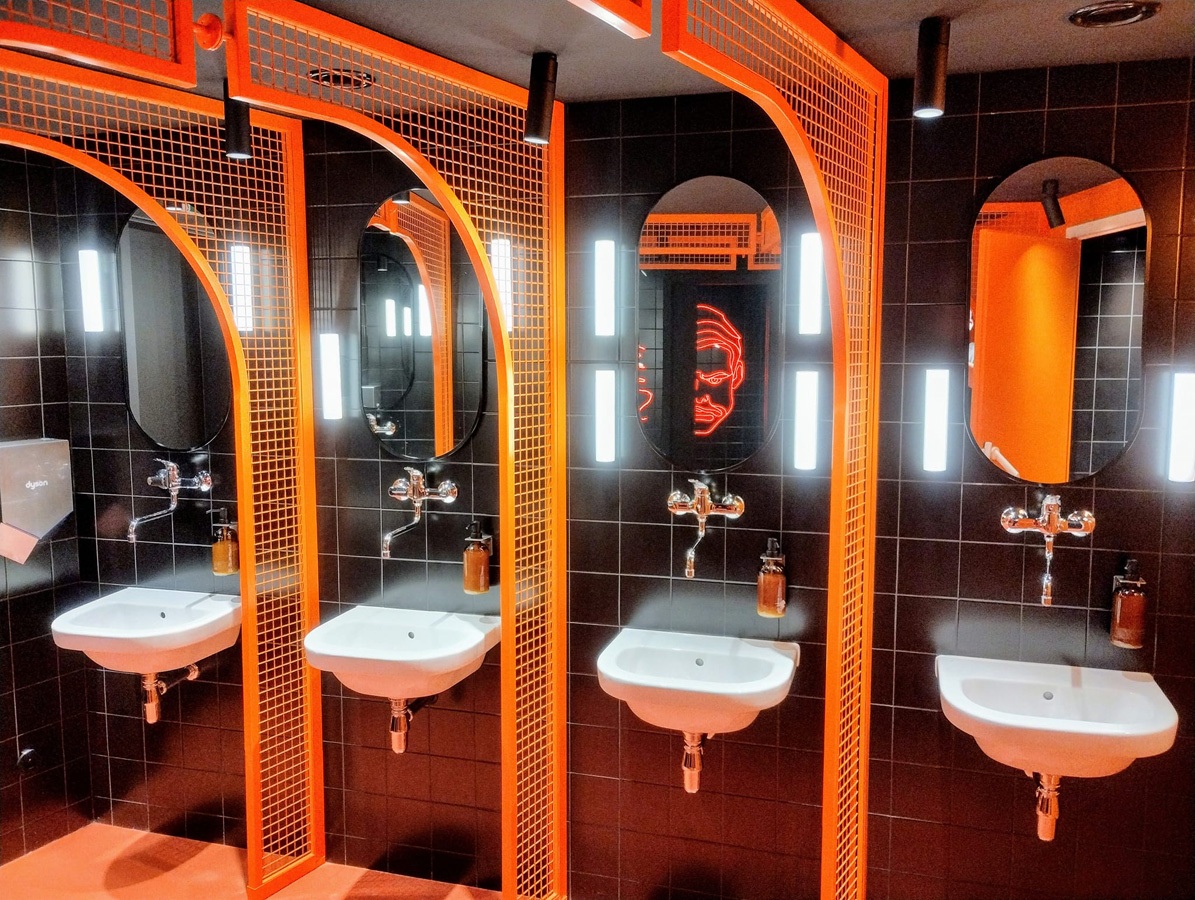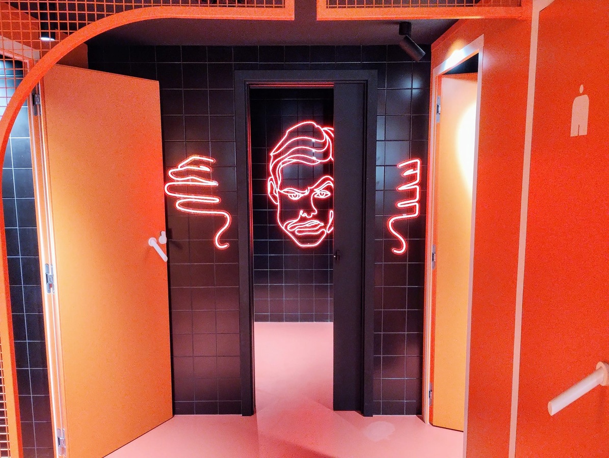 Otevřenost a rozmanitost je viditelná nejen v samotném prostoru restaurace i jejím zázemí, ale i na toaletách s genderově neutrálními kabinkami, za nimiž zpoza koutku s pisoáry vykukuje červený neonový obličej Jacka Nicholsona coby vraždícího maniaka z hororu Shining.