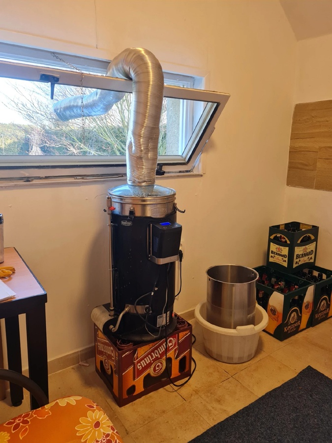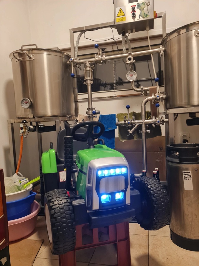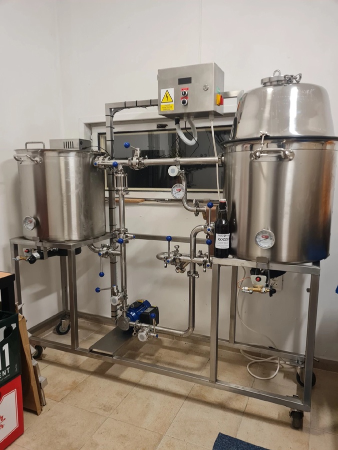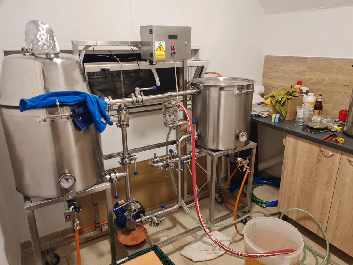 Záhy All-in-One pivovar přestal kapacitně stačit, a tak jsme stavebně upravili část garáže a vybavili jí krásným mini-pivovarem dělaným na zakázku od pana Herky z Hodonína.